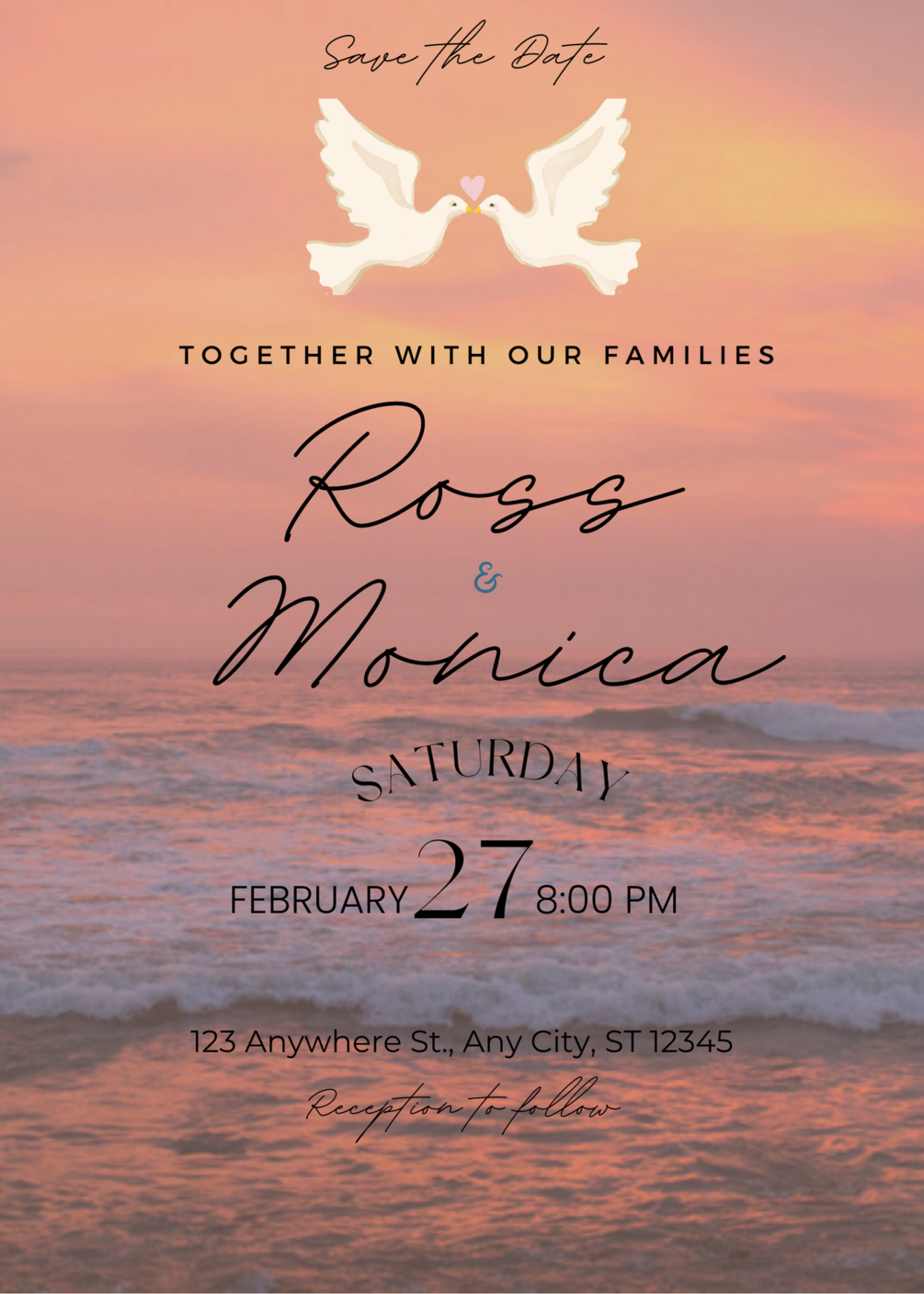 Planning Your Dream Beach Wedding? Need a Wedding Invitation? This Template Captures A Beautiful Sunset by the Ocean Theme While Informing Your Friends And Family About Your Big Day.